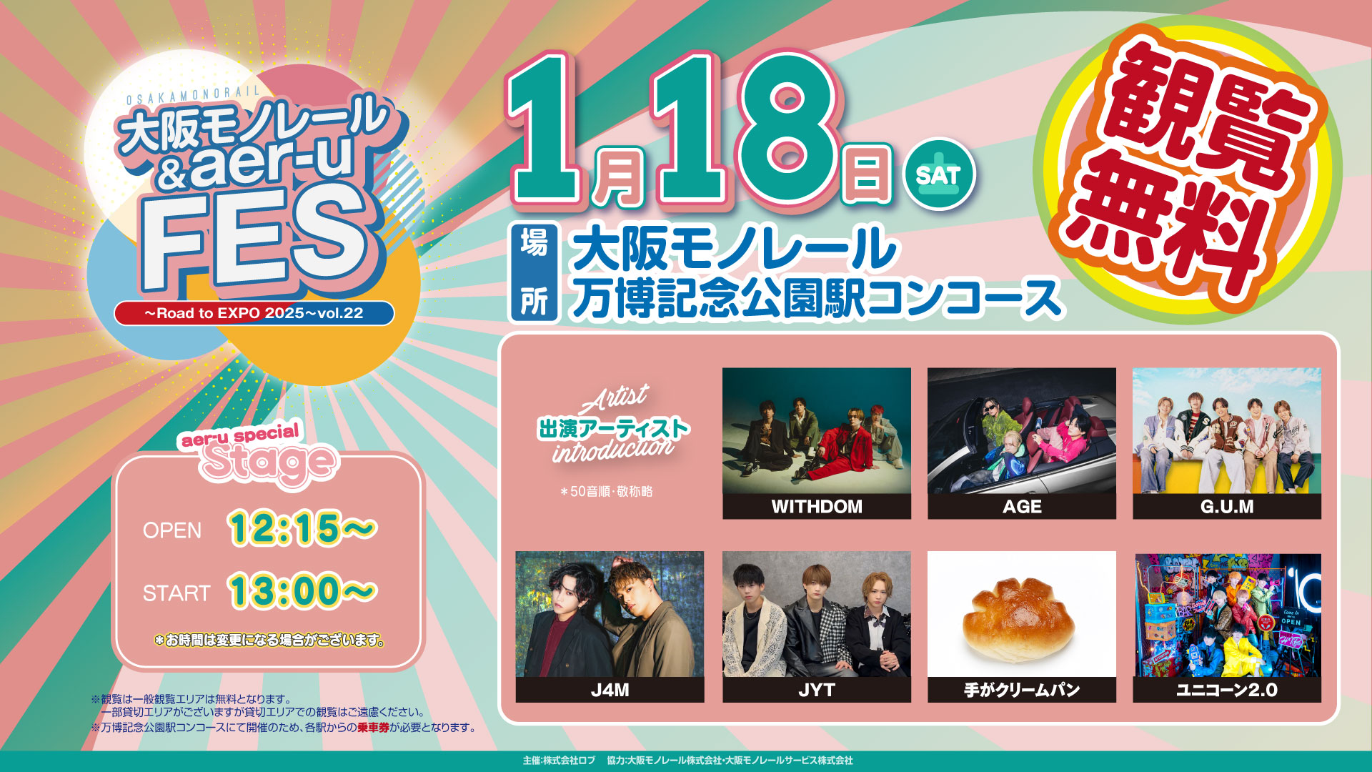 大阪モノレール&aer-u FES ~Road to EXPO 2025~ vol.22 開催日時:2025年1月18日(土) 開場12:15/開演13:00 会場:万博記念公園駅コンコース(大阪府吹田市千里万博公園1) 出演:AGE/G.U.M/WITHDOM/ユニコーン2.0/JYT/J4M/手がクリームパン 観覧無料 イベント詳細はこちら