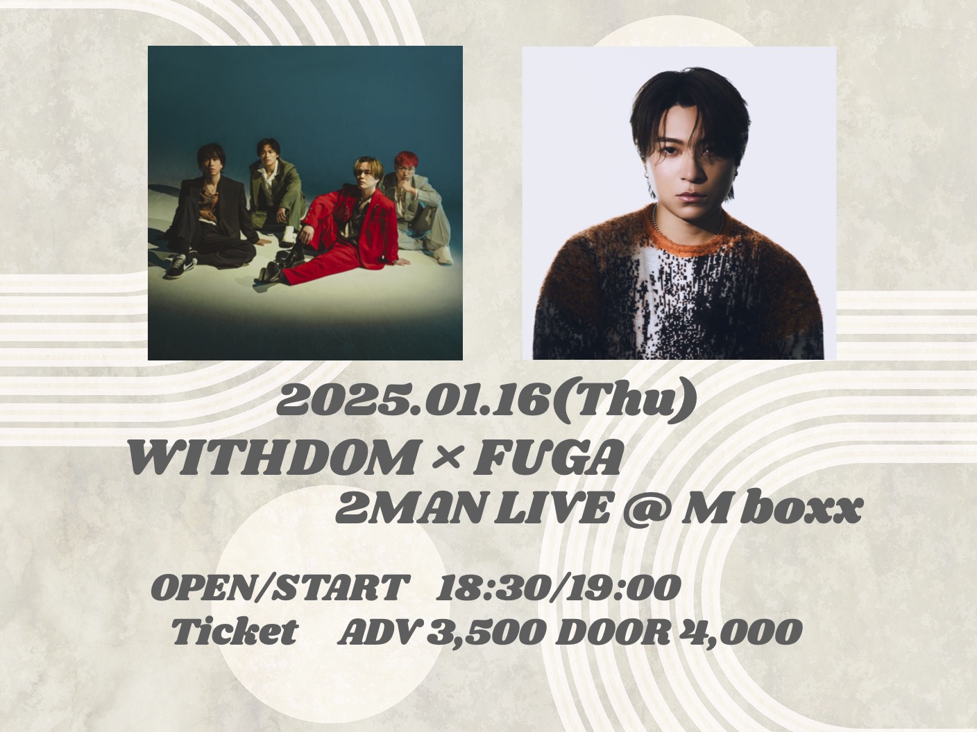 2025年1月16日 WITHDOM×FUGA 2MAN LIVE 【日程】2025年1月16日 【時間】集合:18:20 開演:19:00 【会場】M boxx 【出演者】WITHDOM / FUGA イベント詳細はこちら