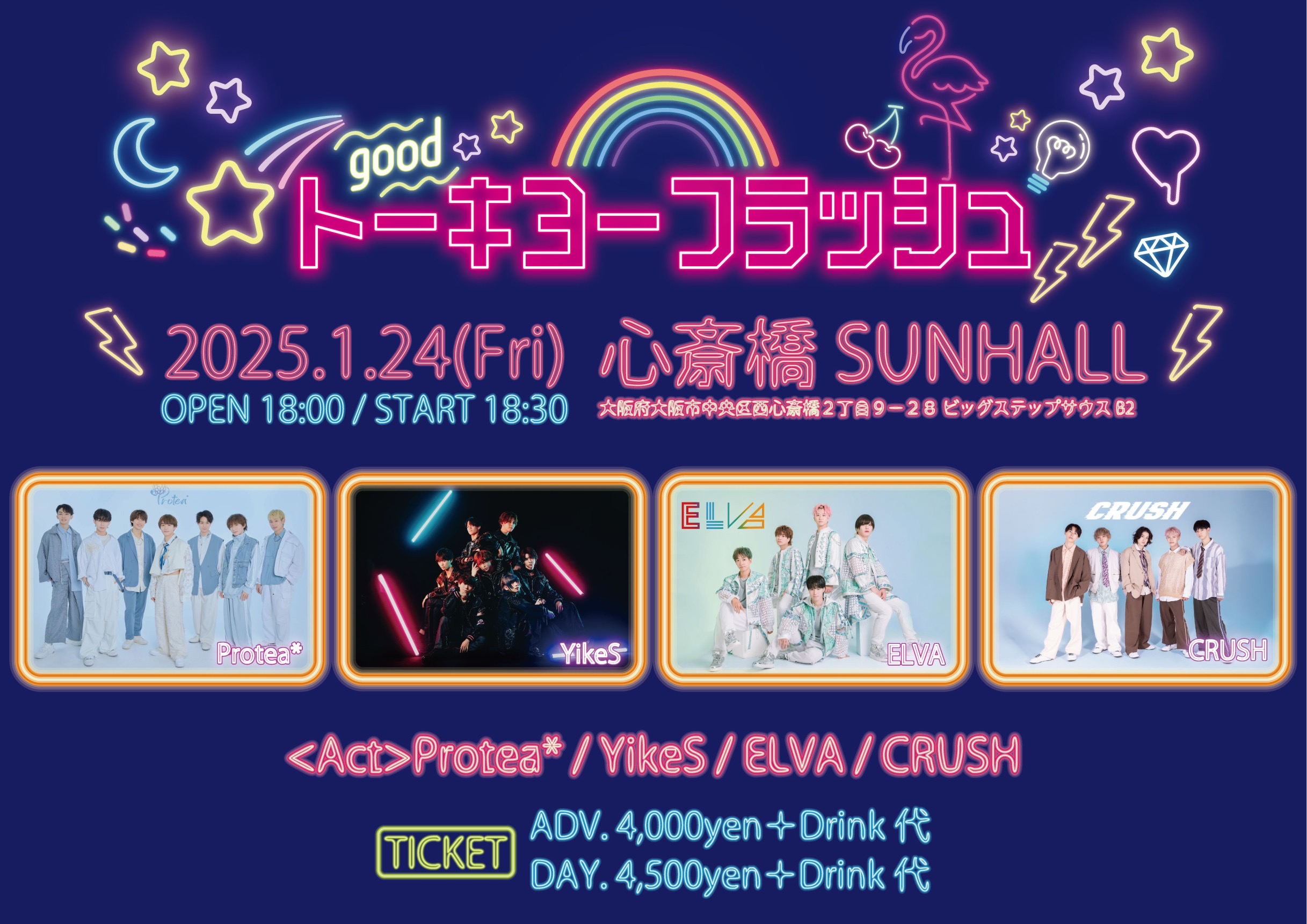 「トーキョーフラッシュ」 開催日時:2025年1月24日(金) OPEN 18:00/START 18:30 会場:心斎橋SUNHALL 観覧:前売り¥4,000 当日¥4,500別途ドリンク代 出演:Protea*、YikeS、ELVA、CRUSH チケット・イベント詳細はこちら
