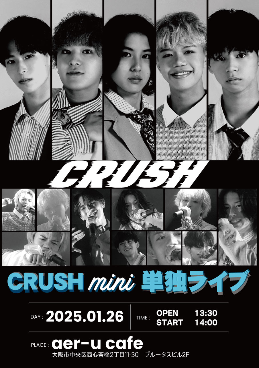 「CRUSH mini 単独ライブ」 開催日時:2025年1月26日(日) OPEN 13:30/START 14:00 会場:aer-u cafe 観覧:手売りチケット¥2,000 ライブポケット¥3,000別途ドリンク代 出演:CRUSH