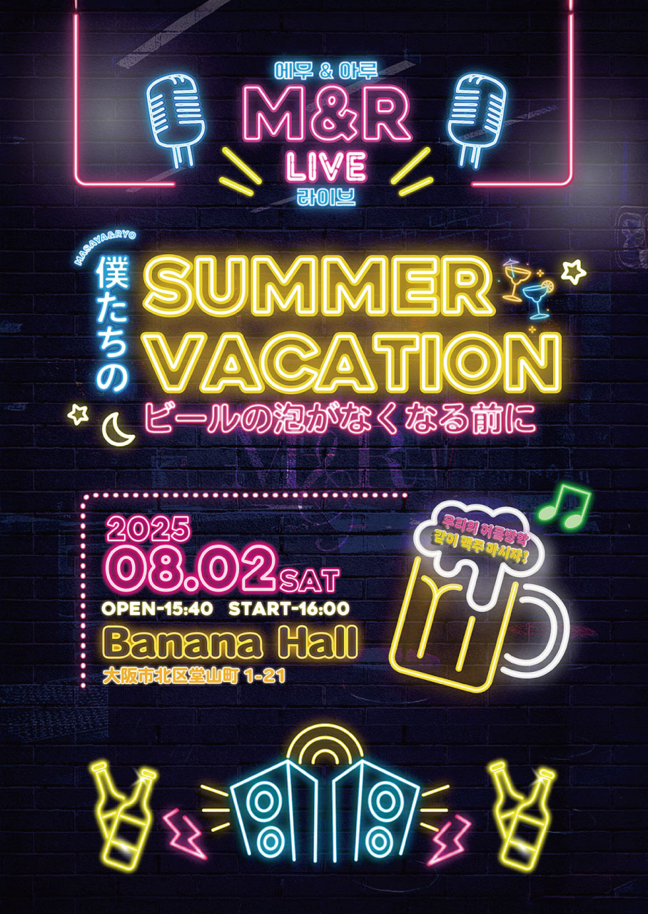 僕たちのSummer Vacation ビールの泡がなくなる前に タイトル:僕たちのSummer Vacation ビールの泡がなくなる前に 開催日時:8/2 開場15:40/開演16:00 出演者:M&R 会場:Banana Hall (〒530-0027大阪府大阪市北区堂山町1-21) チケット:Sチケット ¥15,000-(特典付き) / Aチケット ¥5,500- / Bチケット ¥3,000- イベント詳細はこちら