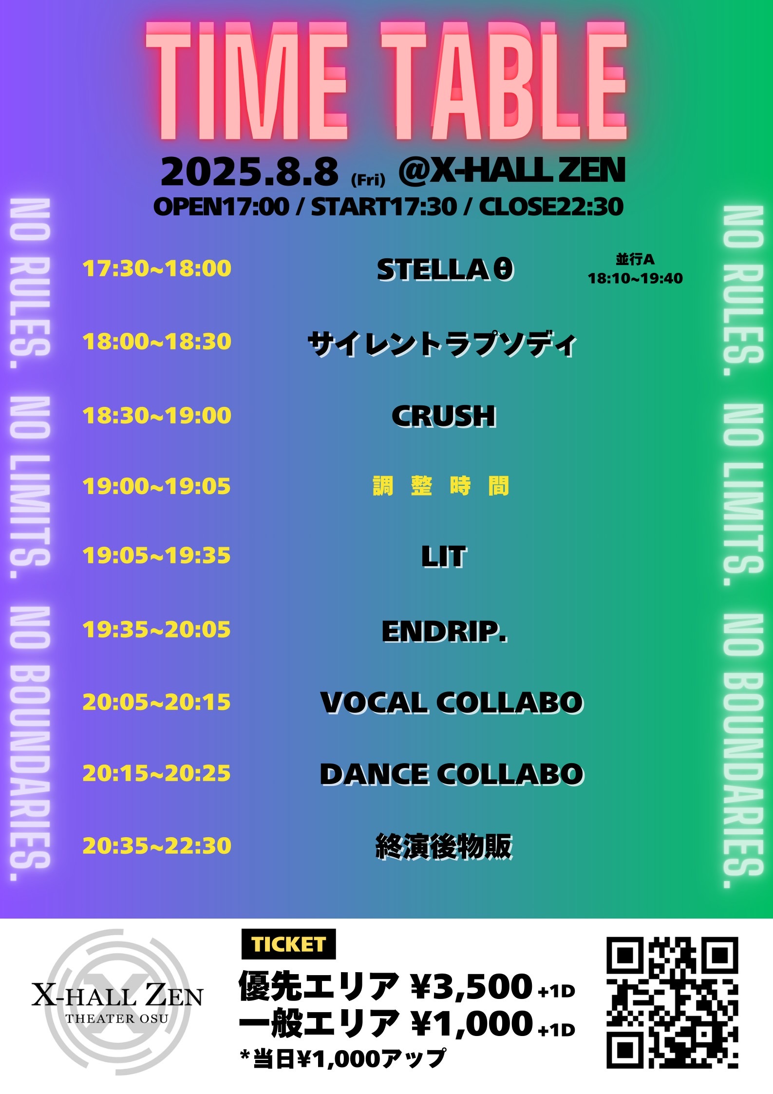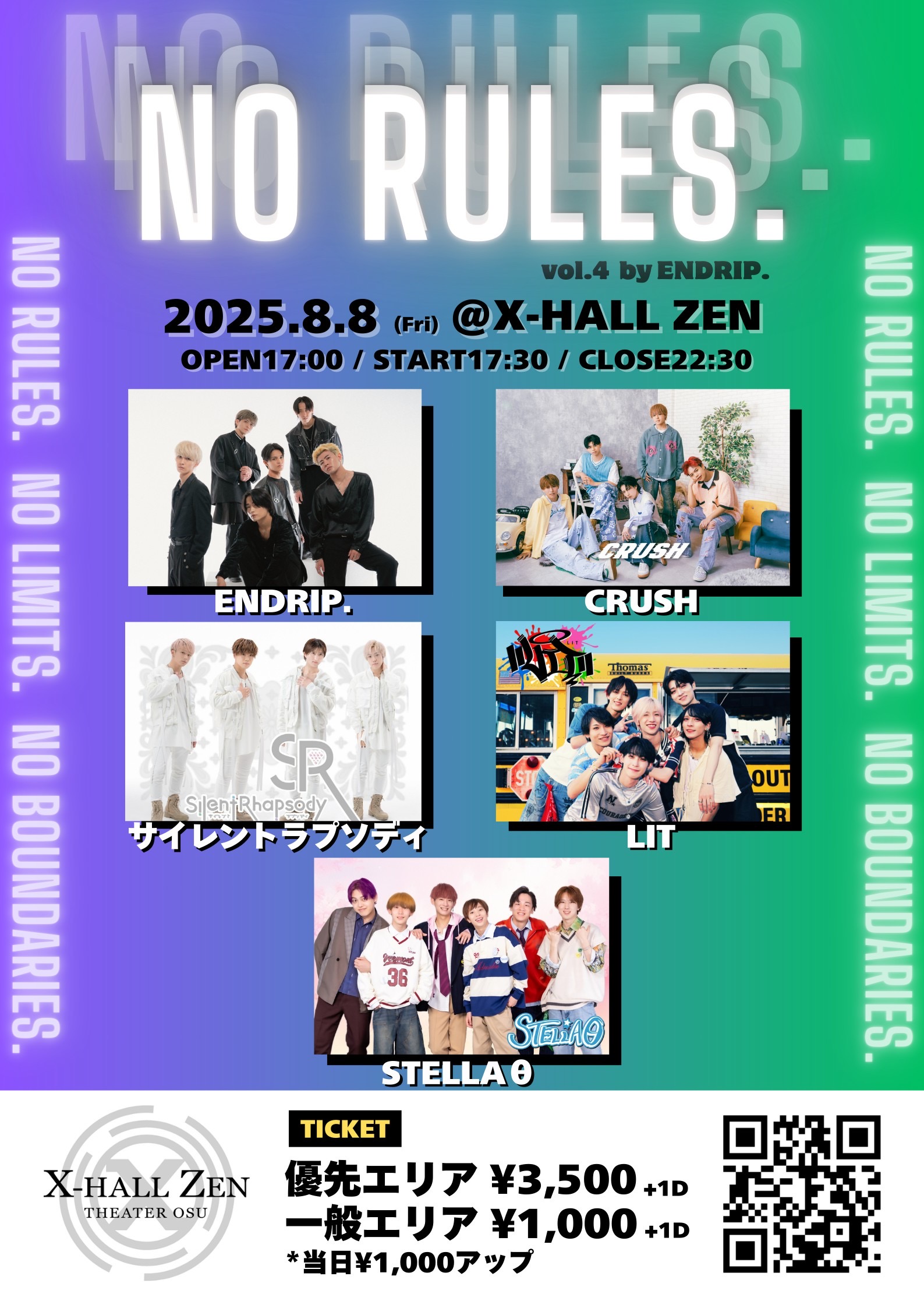NO RULES.by ENDRIP vol.4 開催日時:8/8(金)開場17:00/開演17:30 会場:X-HALL ZEN 出演:CRUSHほか チケット:https://t.livepocket.jp/e/1fjxe イベント詳細はこちら