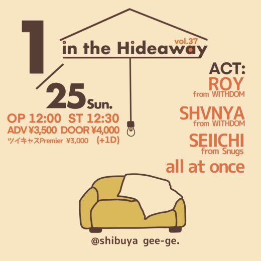 1月25日 in the Hideaway Vol.37 ROY,SHVNYAがソロで出演決定...