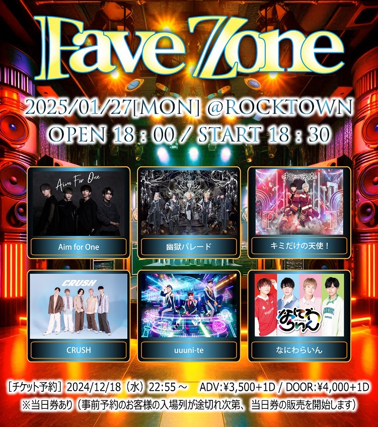 1月27日(月)「Fave Zone」出演 開催日時:2025年1月27日(月) OPEN 18:00/START 18:30 会場:阿部野ロックタウン 観覧:...